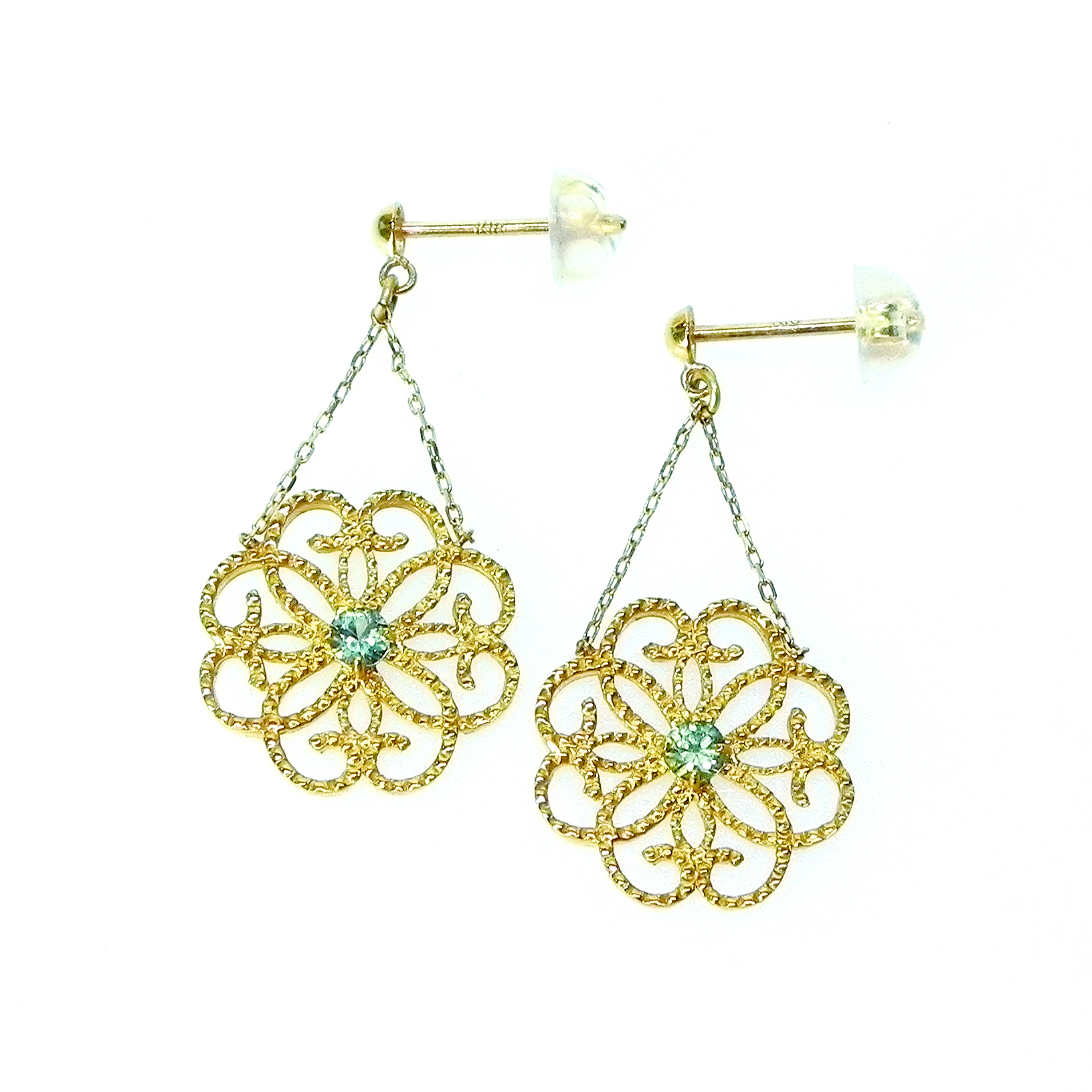 花形の中にワンポイントであしらったグリーンサファイヤがアクセント